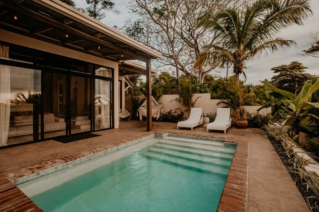 Sansara is situated beachfront with a spectacular view of the Pacific Ocean at your doorstep. Enjoy the ease of walking down the wooden deck onto the black sand beach or the beautiful salt-water pool gazing out at the expansiveness of the ocean. Designed to inspire serenity, the zen-like atmosphere aligns nature and tranquility throughout the grounds. Each room has a private patio and is steps away from the warm Pacific Ocean. Hypo-allergenic bedding, towels, and organic spa products are provided in every cabana.